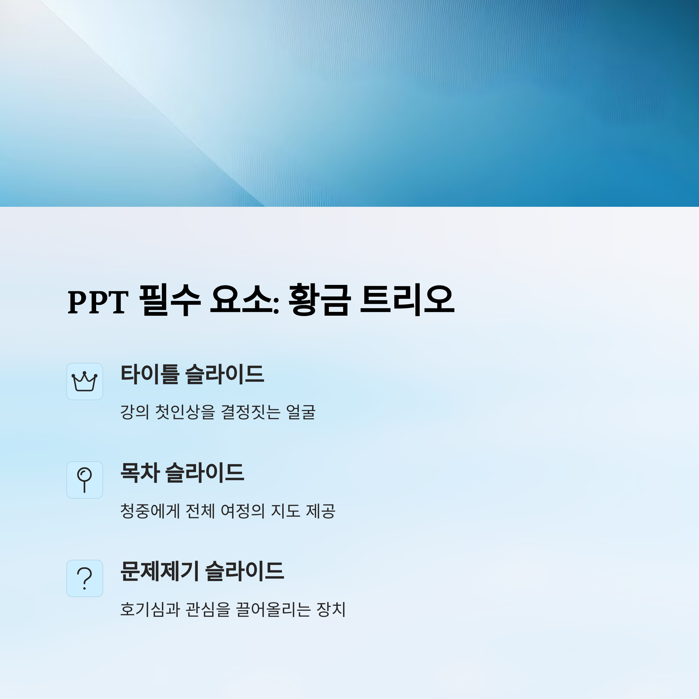 ๐ ๊ฐ์PPT ๊ตฌ์ฑ์ ๊ผญ ๋ค์ด๊ฐ์ผ ํ ์ฌ๋ผ์ด๋ 7๊ฐ์ง: ์ฒญ์ค ์ง์ค๋๋ฅผ ๋์ด๋ ํต์ฌ ์ฝํ ์ธ ์ค๊ณ ๋ฐฉ๋ฒ