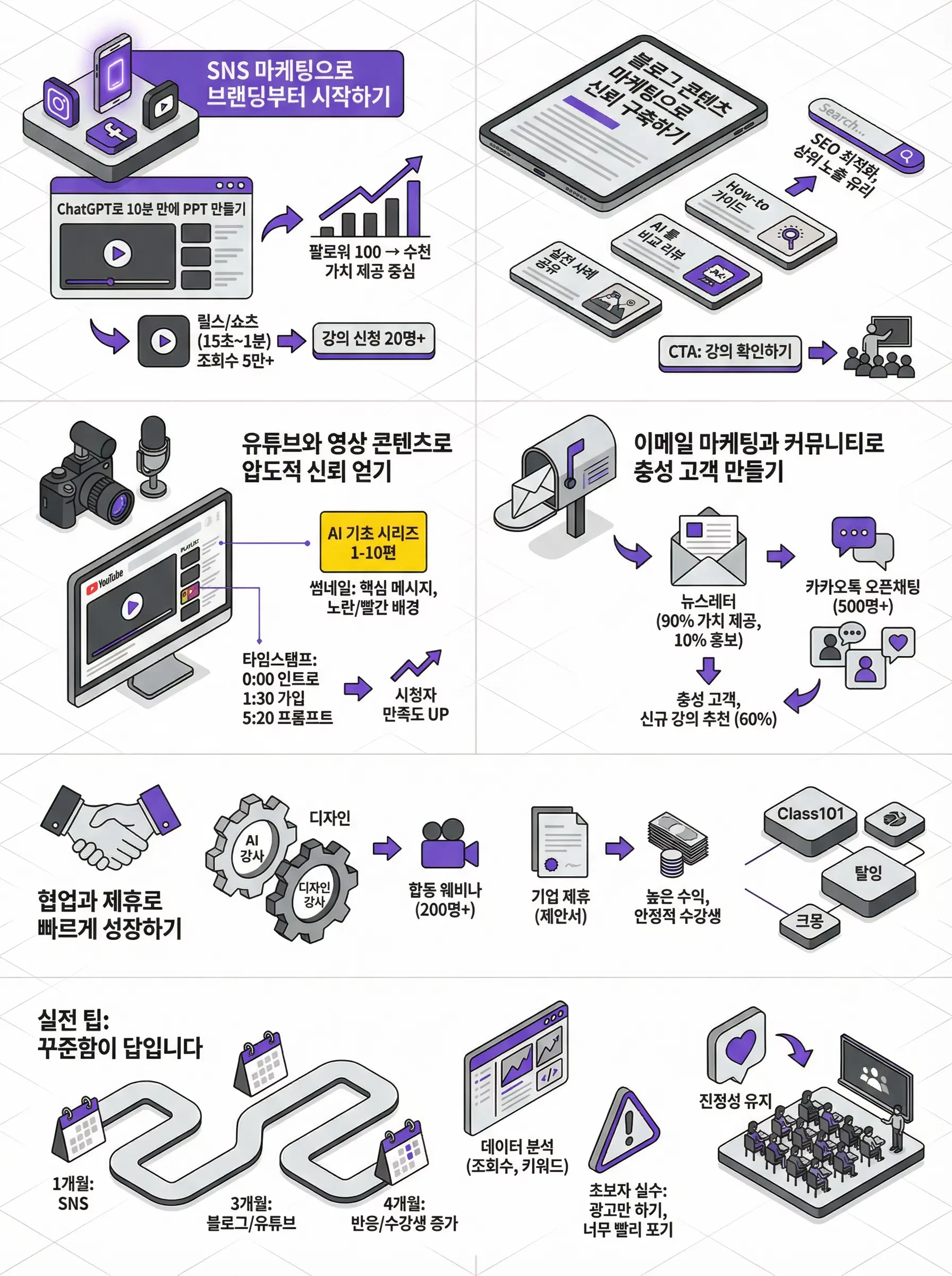 ์ ๊ฐ ์ถ์ฒํ๋ ์์๋ ์ด๋์. ๋จผ์ SNS ๊ณ์ ์ ํ๋ ๋ง๋ค์ด์ ๋งค์ผ AI ํ์ ๊ณต์ ํ์ธ์. ํ ๋ฌ ์ ๋ ํ๋ค ๋ณด๋ฉด ์ด๋ ์ ๋ ๊ฐ์ด ์กํ ๊ฑฐ์์. ๊ทธ๋ค์์ ๋ธ๋ก๊ทธ๋ฅผ ์์ํ๊ณ , ์ฌ์ ๊ฐ ๋๋ฉด ์ ํ๋ธ๋ ์์ํ๋ ๊ฑฐ์ฃ . ์ด๋ฉ์ผ ๋ง์ผํ ์ด๋ ์ปค๋ฎค๋ํฐ๋ ์ด๋ ์ ๋ ํ๋ก์๊ฐ ์๊ธด ํ์ ์์ํด๋ ๋ฆ์ง ์์์.