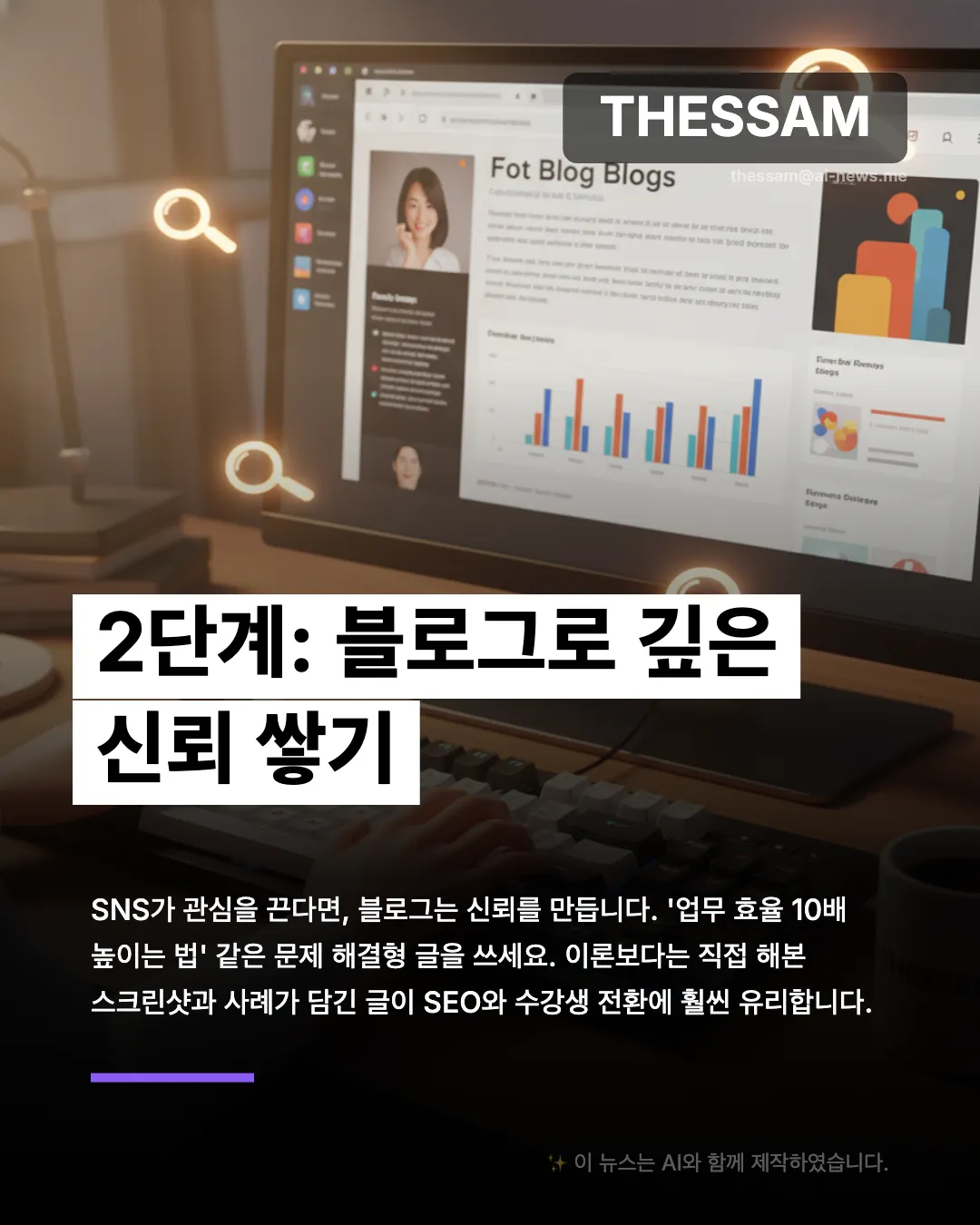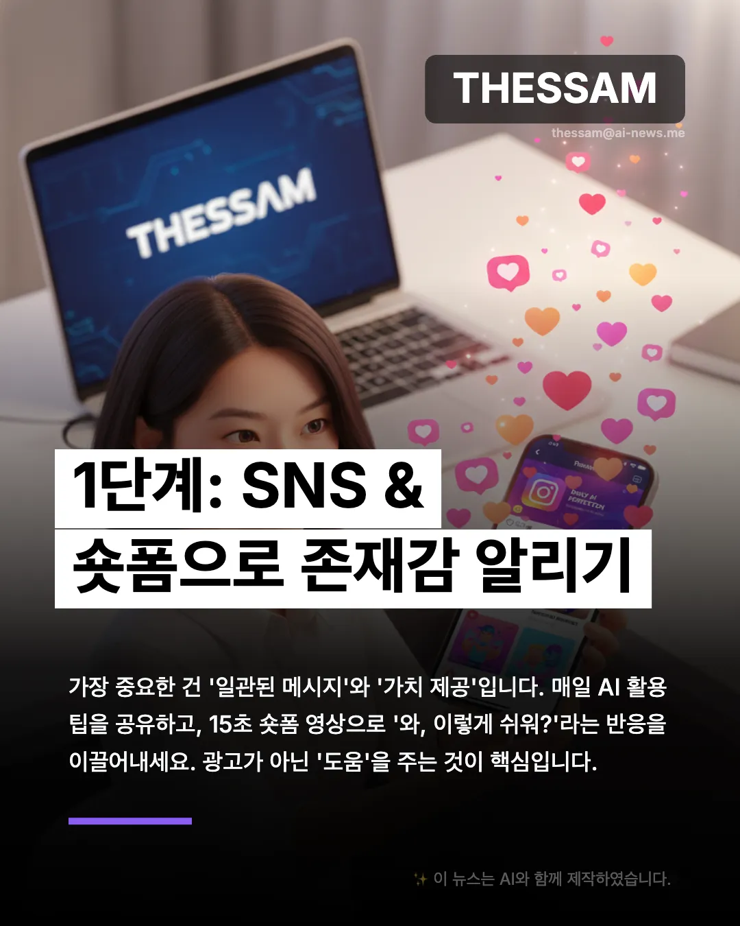 SNS ๋ง์ผํ ์์ ๊ฐ์ฅ ์ค์ํ ๊ฑด ์ผ๋ฐฉ์ ์ธ ํ๋ณด๊ฐ ์๋๋ผ ๊ฐ์น ์ ๊ณต์ด์์. ์ฌ๋๋ค์ ๊ด๊ณ ๋ฅผ ์ซ์ดํ์ง๋ง, ์์ ์๊ฒ ๋์์ด ๋๋ ์ ๋ณด๋ ์ ๊ทน์ ์ผ๋ก ์ฐพ์์. ๊ทธ๋์ ์ ๋ ๋ฌด๋ฃ๋ก AI ํ์ฉ ํ์ ๊ณ์ ๊ณต์ ํ๋ฉด์, ์์ฐ์ค๋ฝ๊ฒ "๋ ๊น์ด ๋ฐฐ์ฐ๊ณ ์ถ์ผ๋ฉด ์ ๊ฐ์๋ฅผ ๋ค์ด๋ณด์ธ์"๋ผ๋ ๋ฉ์์ง๋ฅผ ์ ๋ฌํ๋ต๋๋ค.